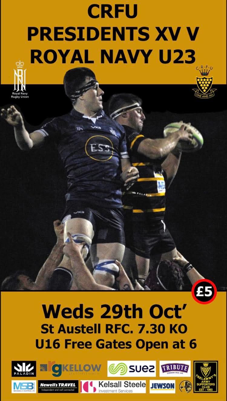 A Cornwall President’s XV will play the Royal Navy Under 23s under the lights at Tregorrick Park St. Austell on Wednesday 29th October, kick-off 7:30 pm.