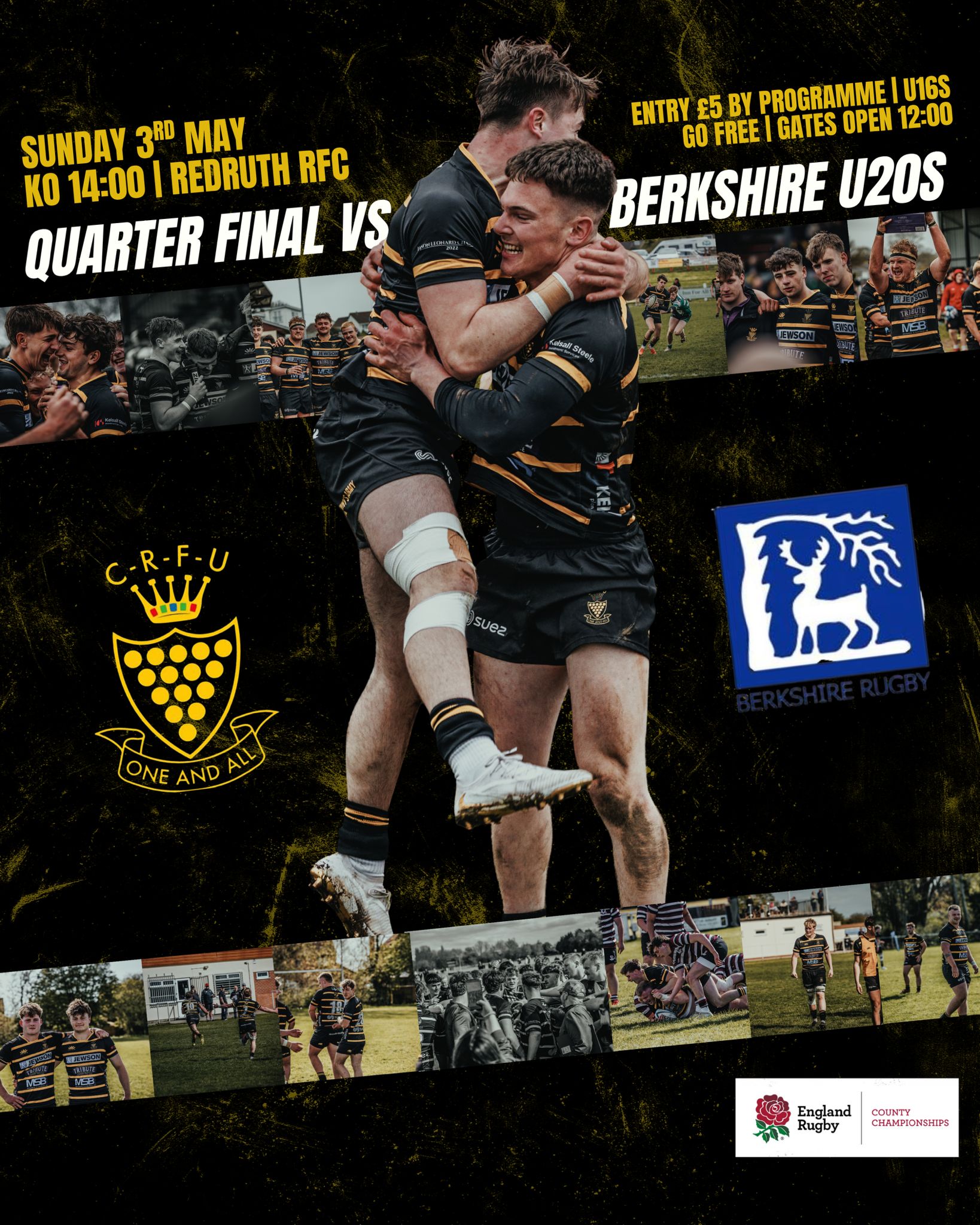 On Sunday May 3rd, Cornwall Under 20s play Berkshire Under 20s in the Quarter-final of the Jason Leonard Cup at Redruth RFC kick-off 2 pm.