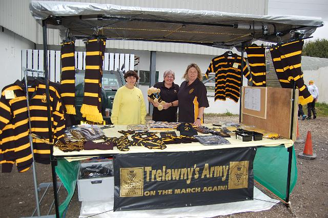 The Trelawny's Army Merchandise stall, with Army members Pearl, Viv, and Marina.