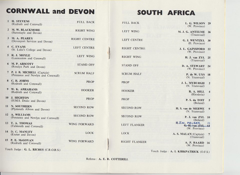 8 1960 Team lists for Cornwall & Devon v South Africa |