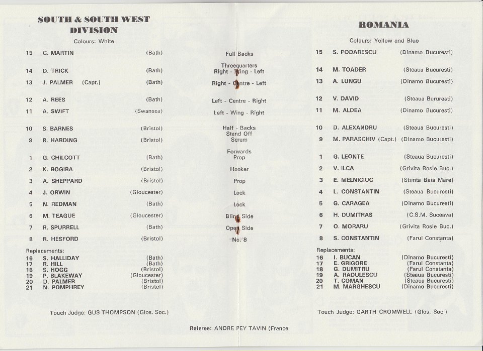 32 1985 Team lists for South & South West of England v Romania |