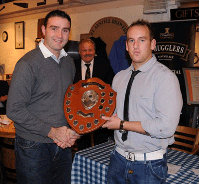 The Cornwall Player of the Year 2009 Ryan Westren (right) is presented with the Bill Osborne Memorial Shield by Mark Stephens. In the background is TASC President John Treglown, from St. Austell Brewery. Photo by Richard Major.