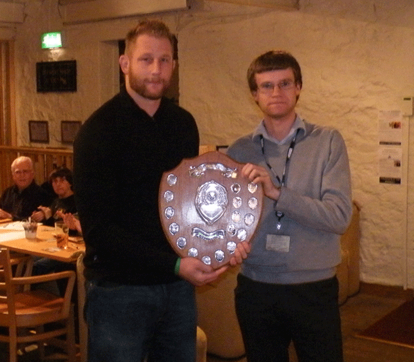 Radio Cornwall's Ross Ellis presents the Bill Osborne Memorial Shield to Mark Bright